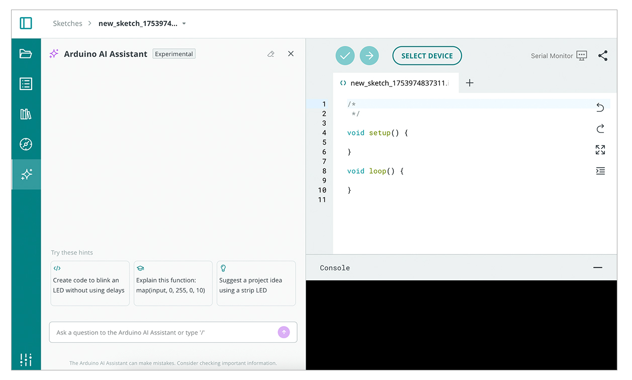 Built right into the Arduino Cloud, the Arduino AI Assistant helps you: