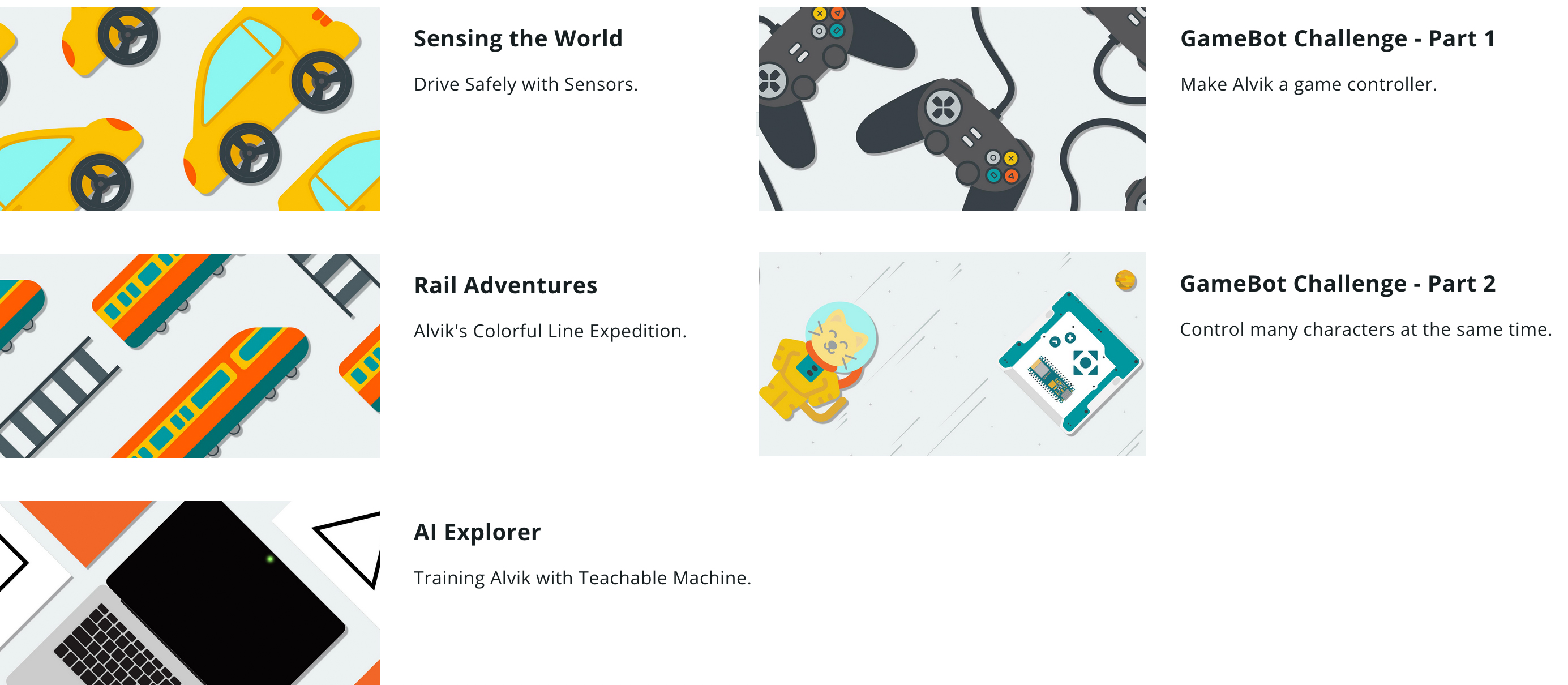 - Alvik Zoo: Sensor-driven behaviors inspired by animal instincts.