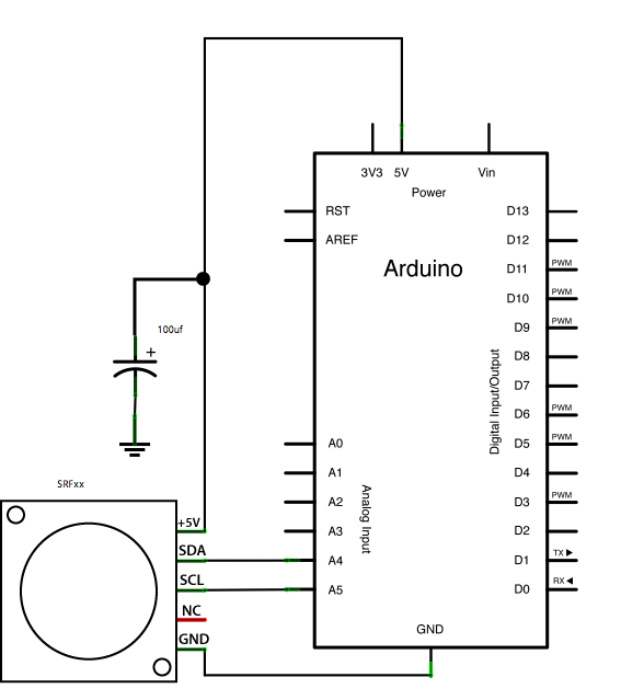 Attach the SDA pin of your SRFxx to analog pin 4 of your board, and the SCL pin to analog pin 5. Power your SRFxx from 5V, with the addition of a 100uf capacitor in parallel with the range finder to smooth it's power supply.